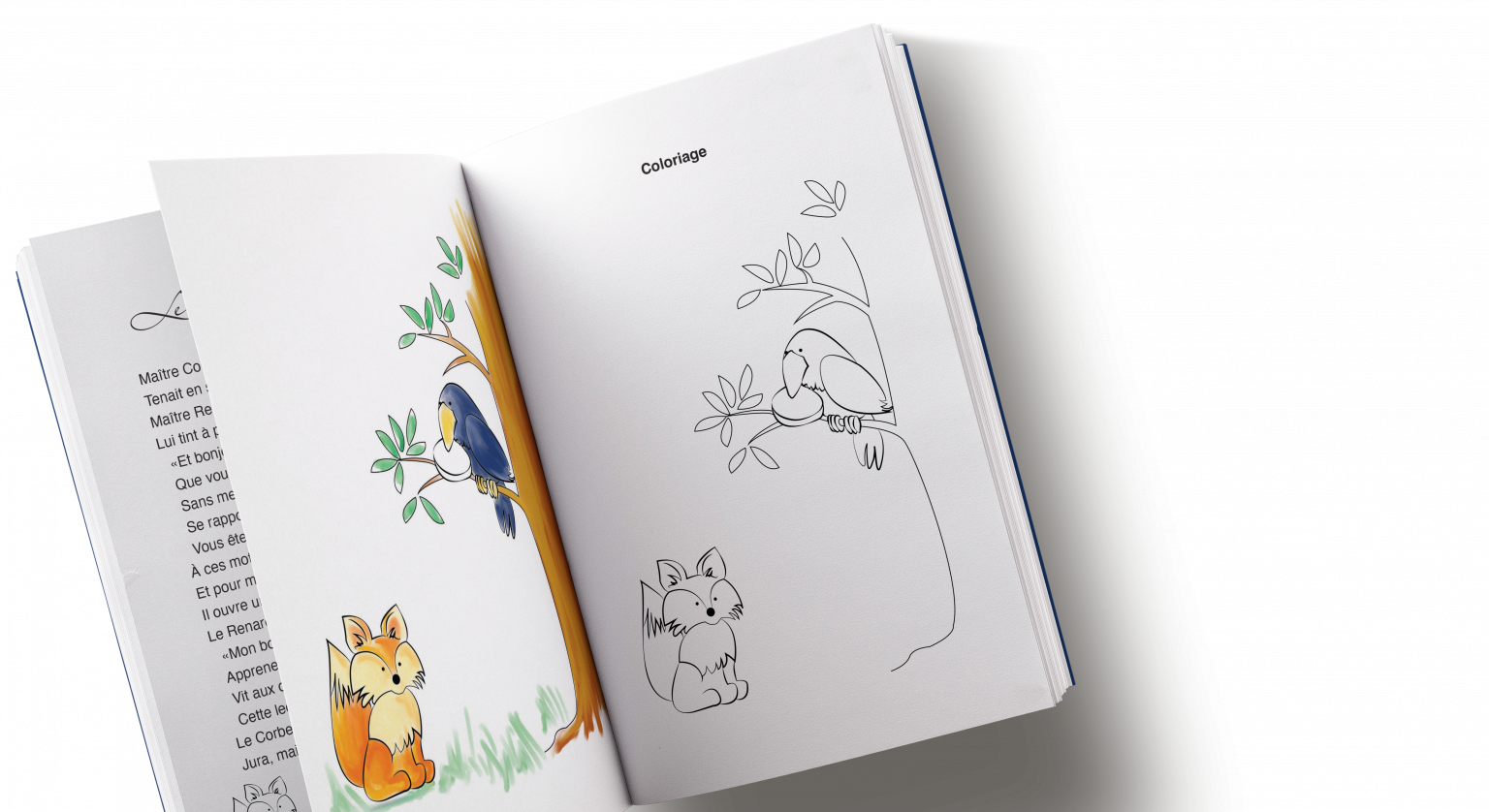 COUVERTURE : – Sous licence Jean de La Fontaine* ou personnalisée – Souple sur papier 250 g/m2, ou rigide contrecollée rembordée 4 faces sur carton 900 g/m2 – Imprimée en quadrichromie avec pelliculage (brillant, mat ou soft touch), vernis sélectif U.V. ou 3D